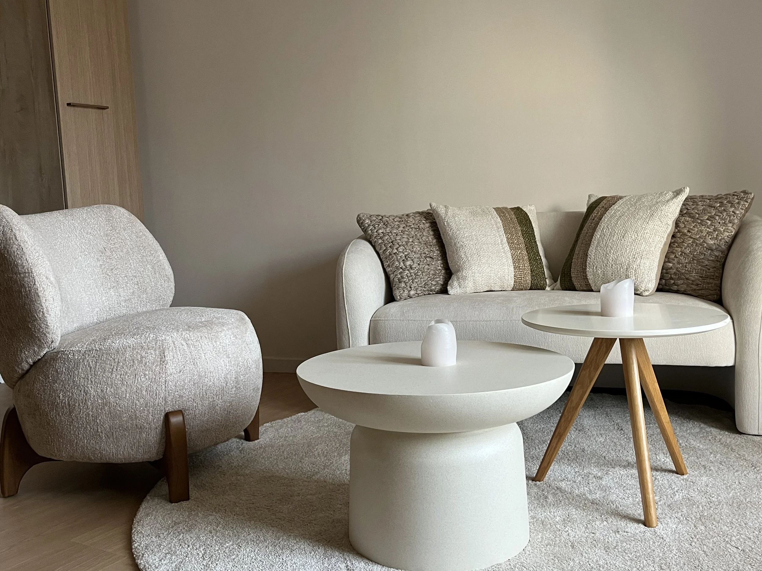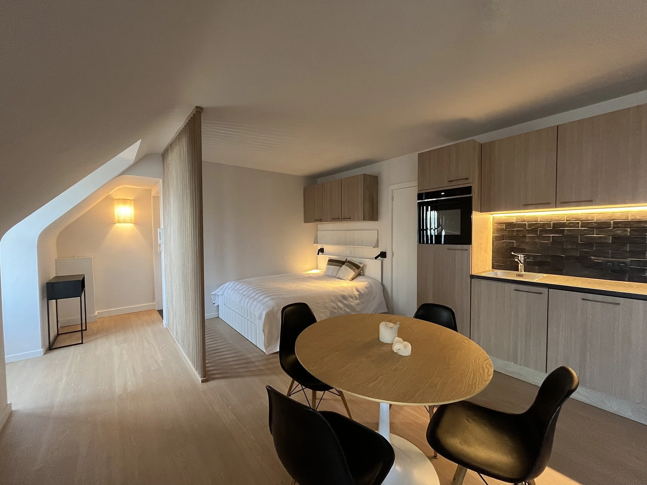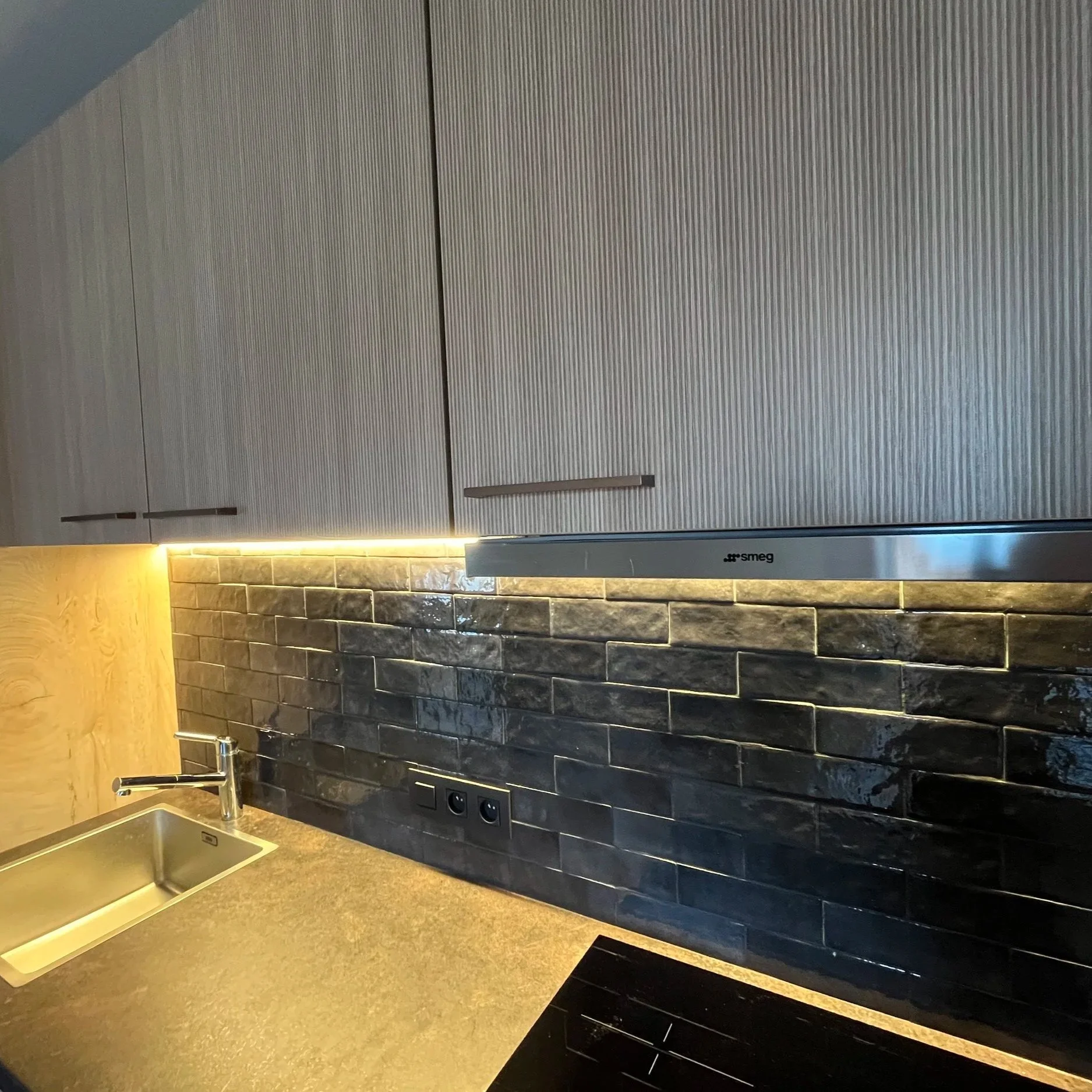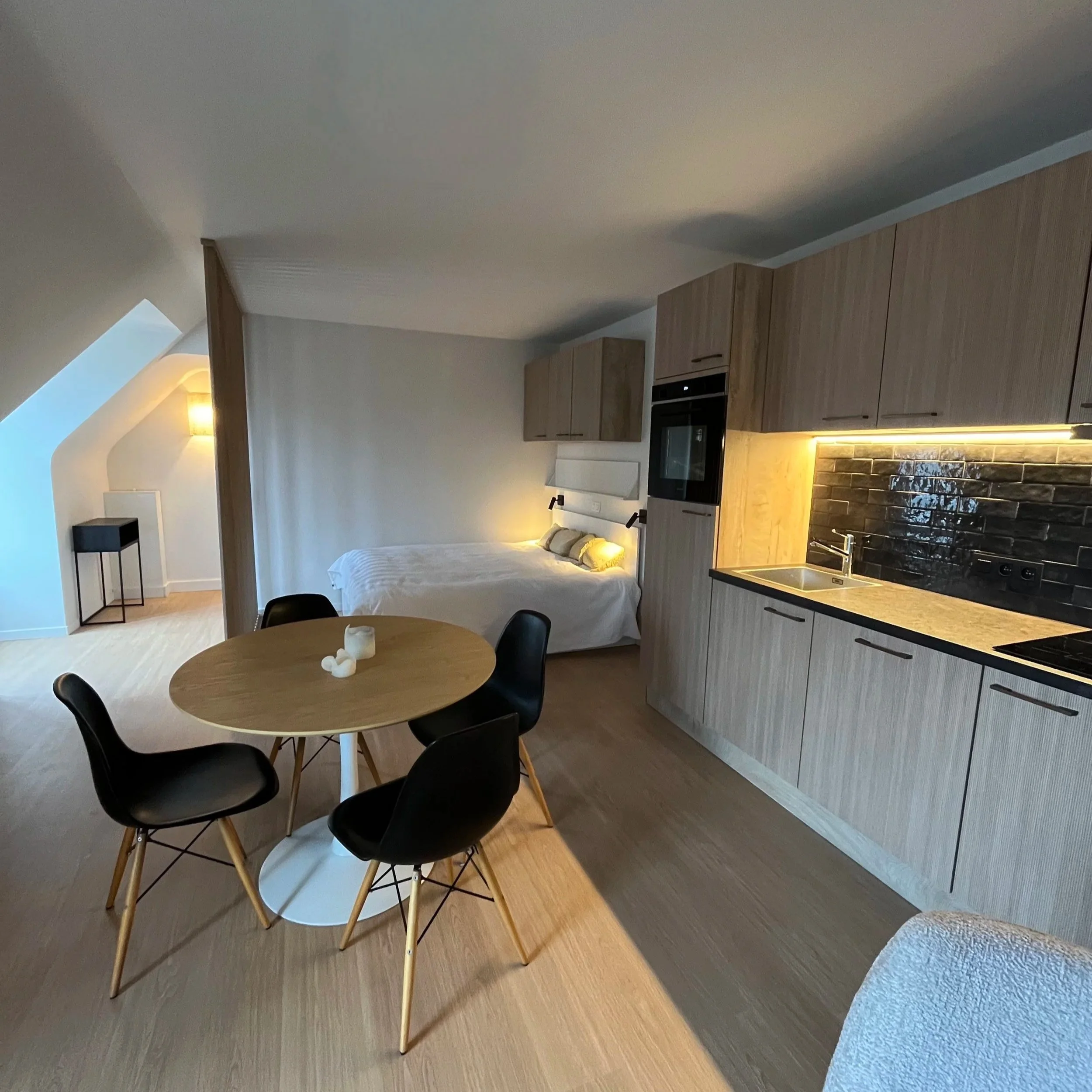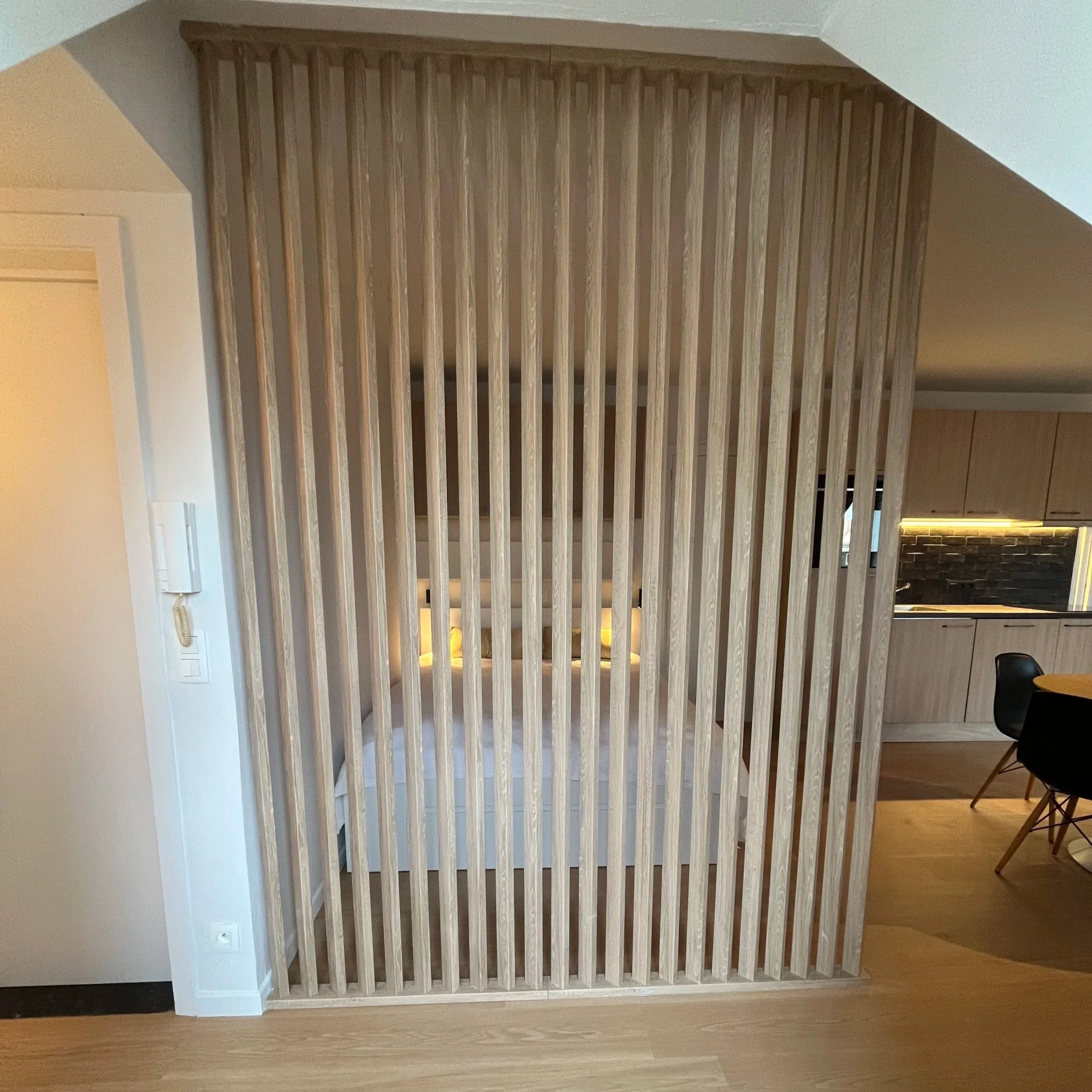 Ce studio de 38 m², autrefois laissé à l’abandon et dans un état de dégradation avancée, a fait l’objet d’une transformation complète et minutieuse. Chaque élément a été repensé en profondeur, depuis les gaines techniques, le système de chauffage et l’installation électrique, jusqu’à l’organisation des circulations et la conception des différents espaces de vie. Un espace nuit intimiste vient se loger discrètement derrière des claustras en tasseaux, créant une séparation subtile tout en préservant la luminosité et la fluidité visuelle. La cuisine dialogue harmonieusement avec le séjour et équilibre l’ensemble des volumes.
