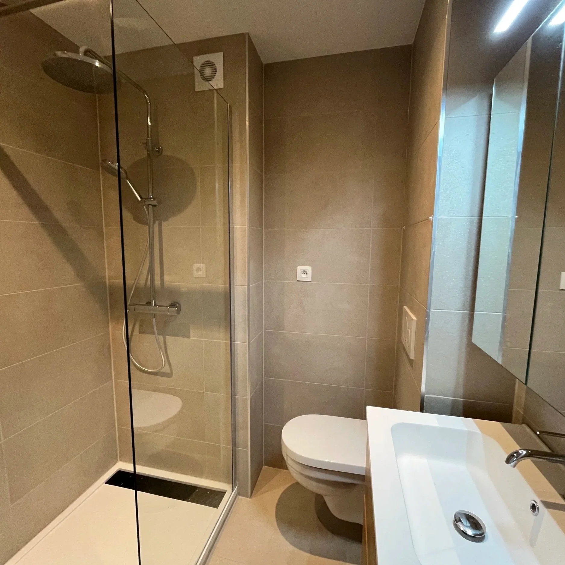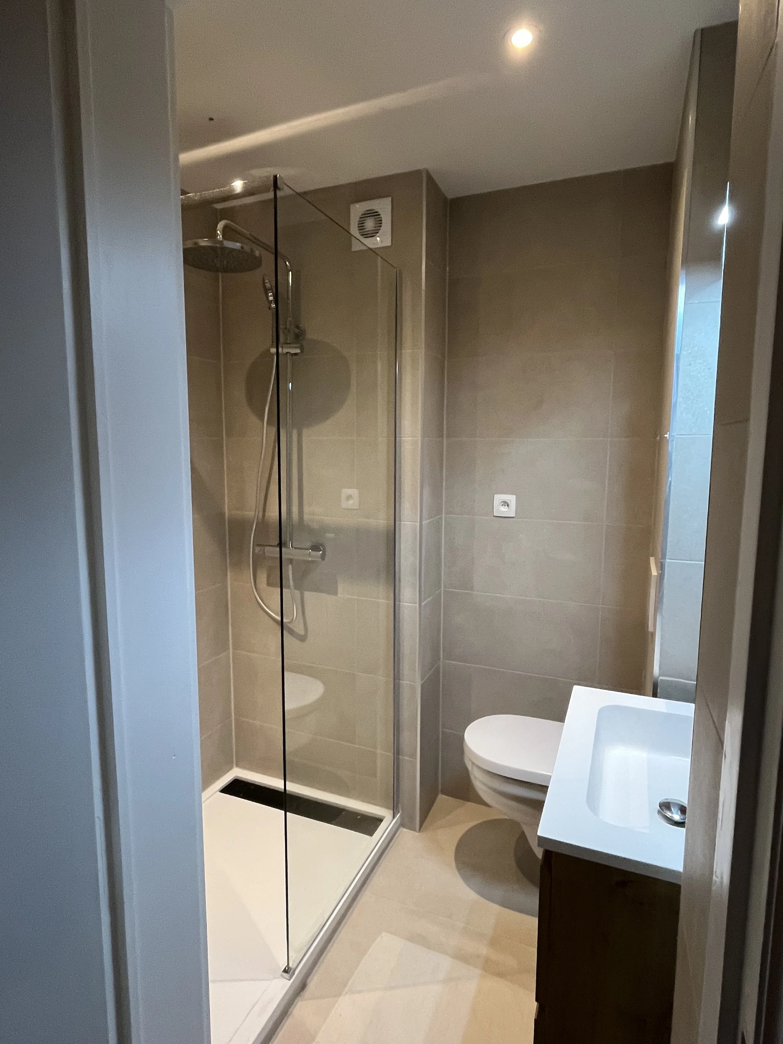 La salle de bain, indépendante, a également été intégralement repensée pour offrir confort et modernité, s’inscrivant pleinement dans cette rénovation globale.