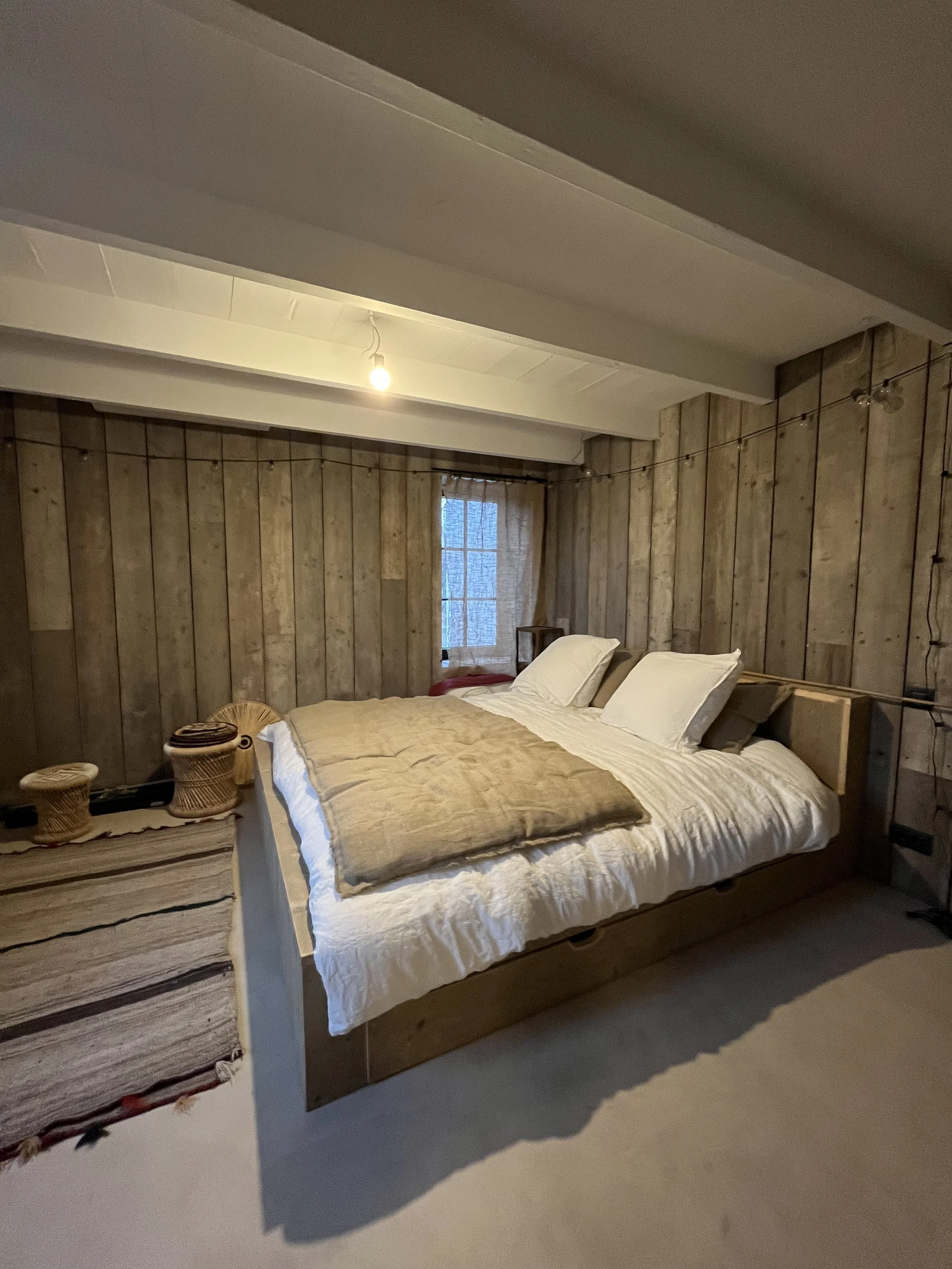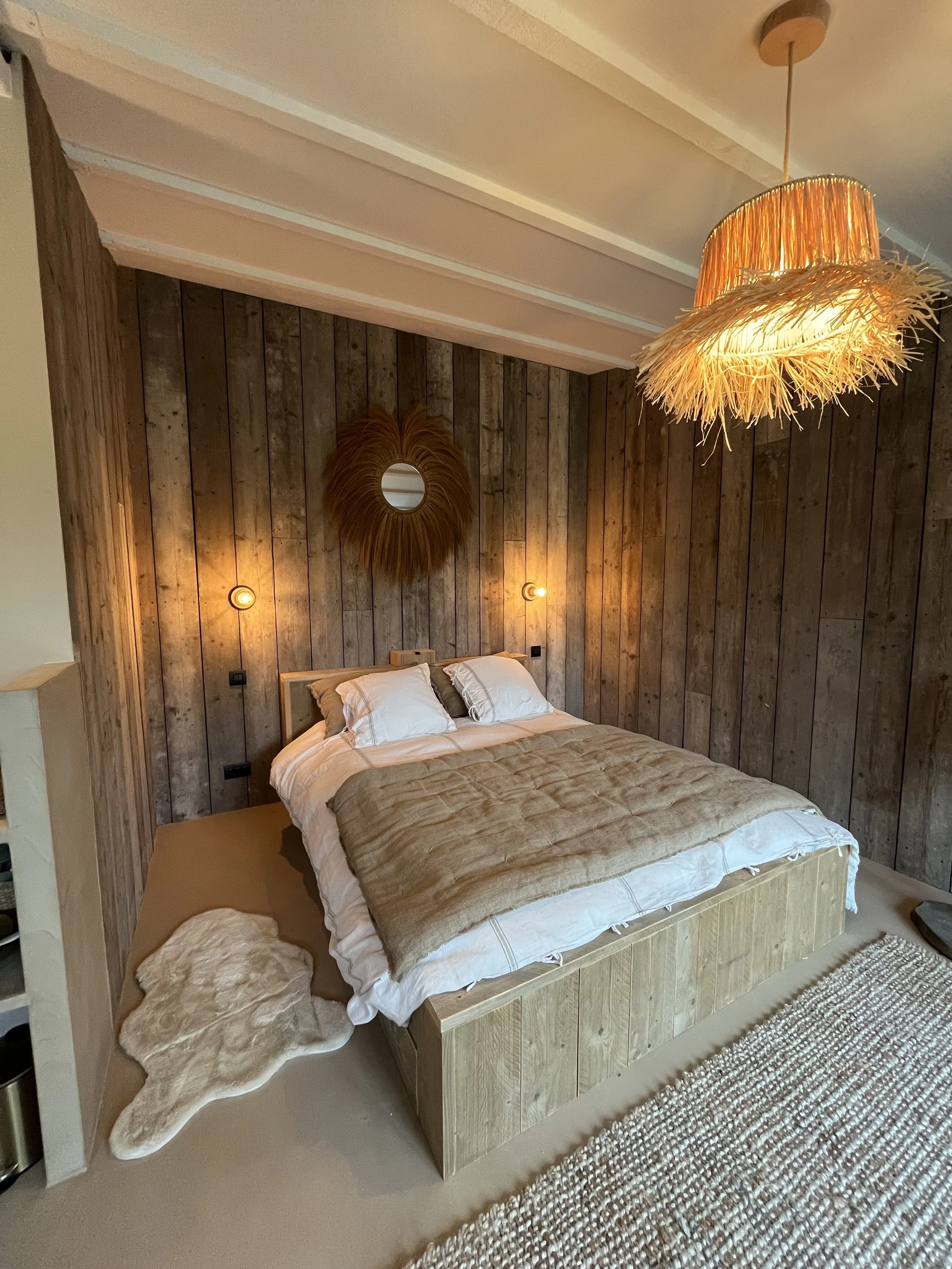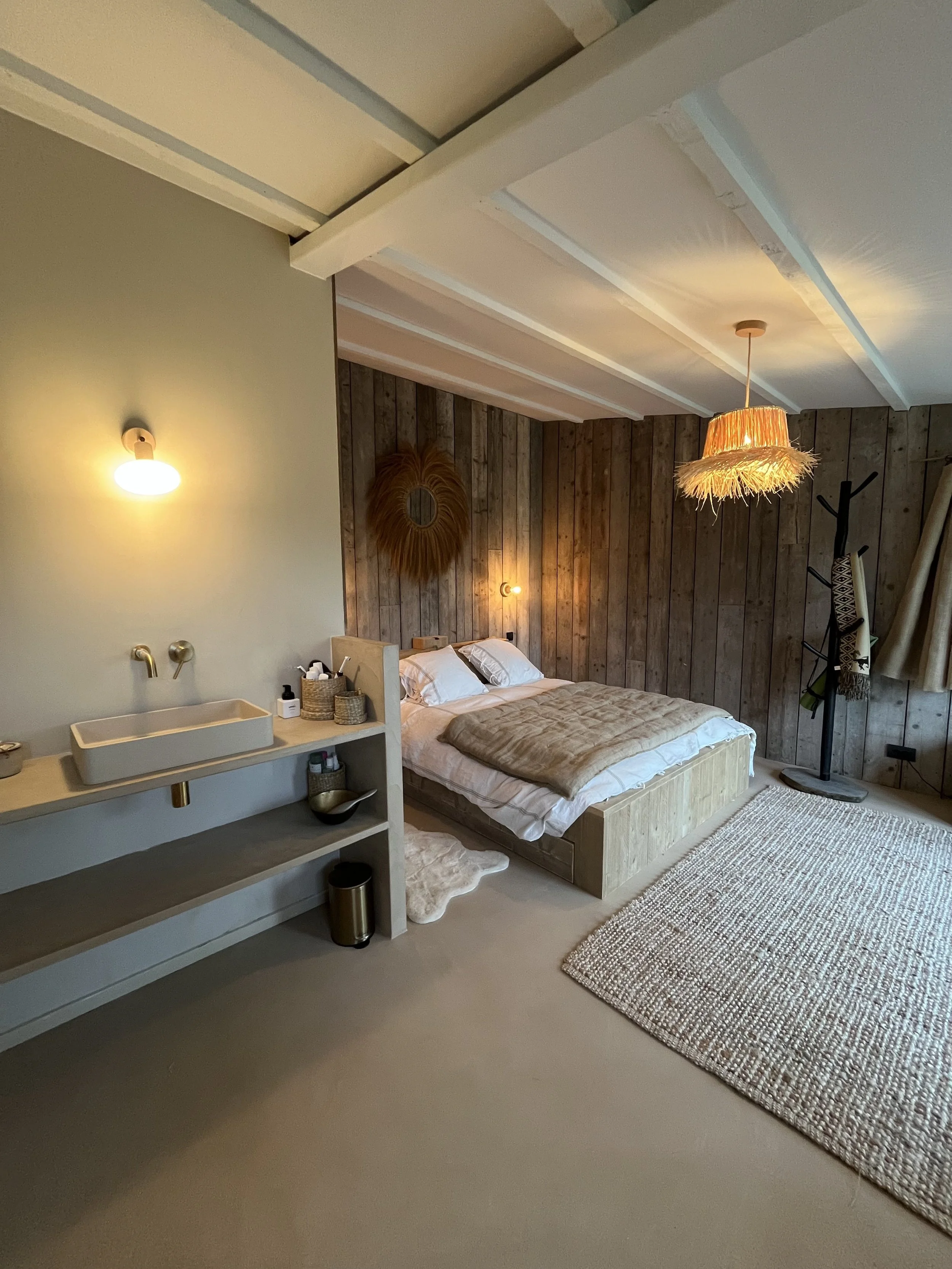 Cette fermette située aux Pays-Bas, à la frontière belge, a été entièrement rénovée à l’intérieur et à l’extérieur. D’une habitation 1 chambre et 1 salle de bain, elle a été transformée en 2 chambres, 2 salles de bains et un bureau. Sols et salles de bain en mortex, murs en chêne vieilli, le tout donne une atmosphère chaleureuse et cosy.